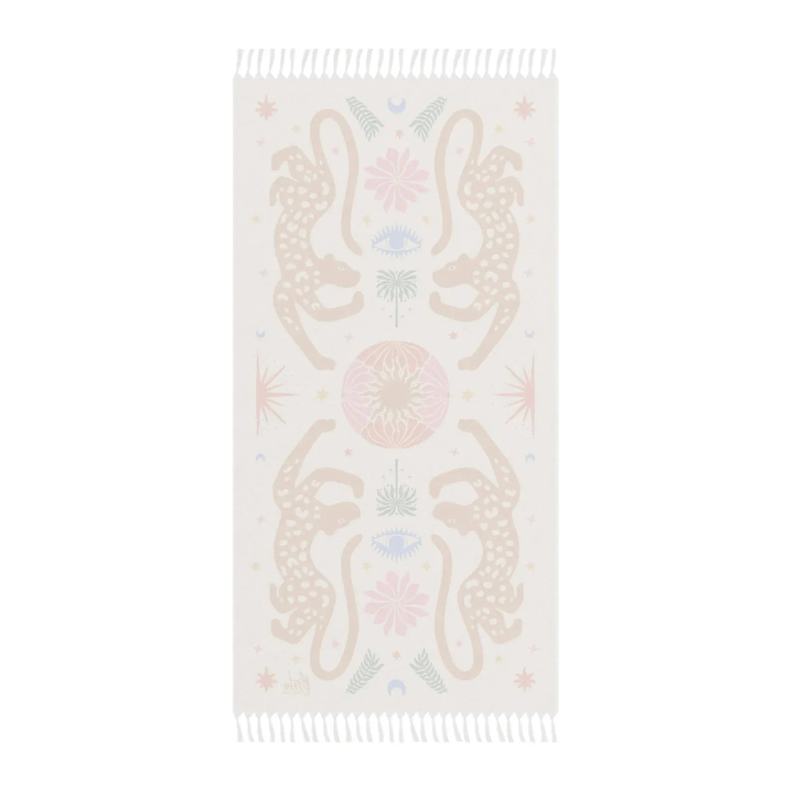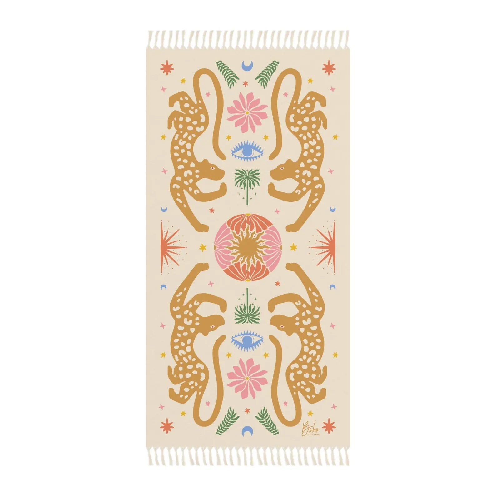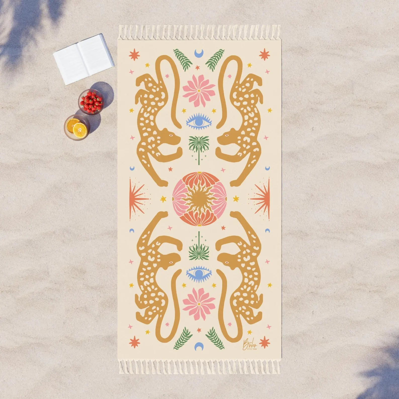 Our Jaguar Boho Beach Cloth is a bold and expressive accessory designed for free spirits and sun seekers. Featuring vibrant boho illustrations of jaguars, evil eyes, celestial suns, moons, and stars, this multi-purpose beach blanket adds color and intention to every adventure. Made from durable 100% polyester, it is lightweight, quick-drying, and easy to pack, perfect for beach days, camping trips, picnics, music festivals, or spontaneous road trips. The soft yet sturdy fabric offers a comfortable surface for lounging, while the tasseled edges add a stylish finish. Whether you are spreading it on the sand, using it as a wrap, or adding flair to your camp setup, this compact beach blanket brings your bohemian soul to life.