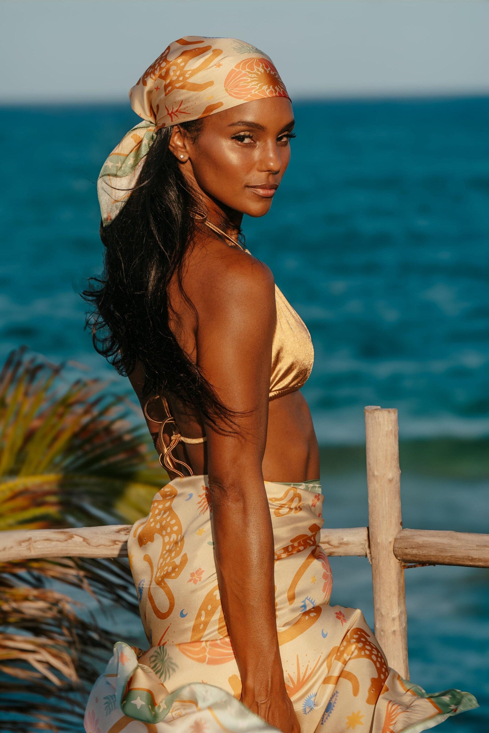 Designed for versatility, this silk scarf can be worn as a headscarf, neck accessory, chic top, or breezy sarong, seamlessly taking you from sunlit days to moonlit nights with ease.