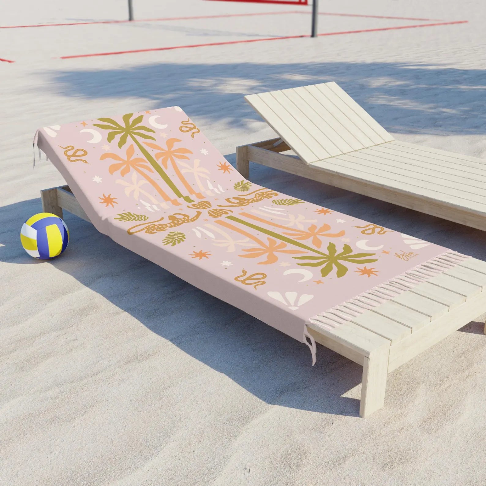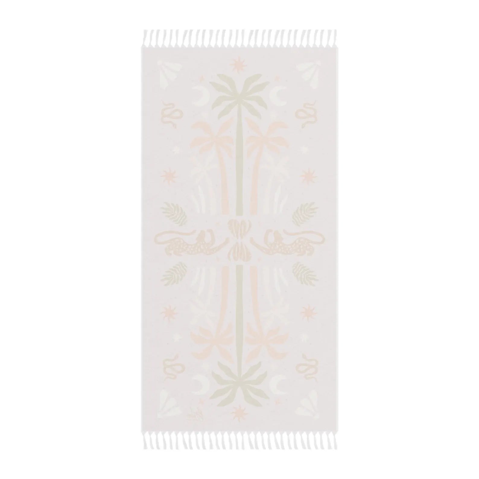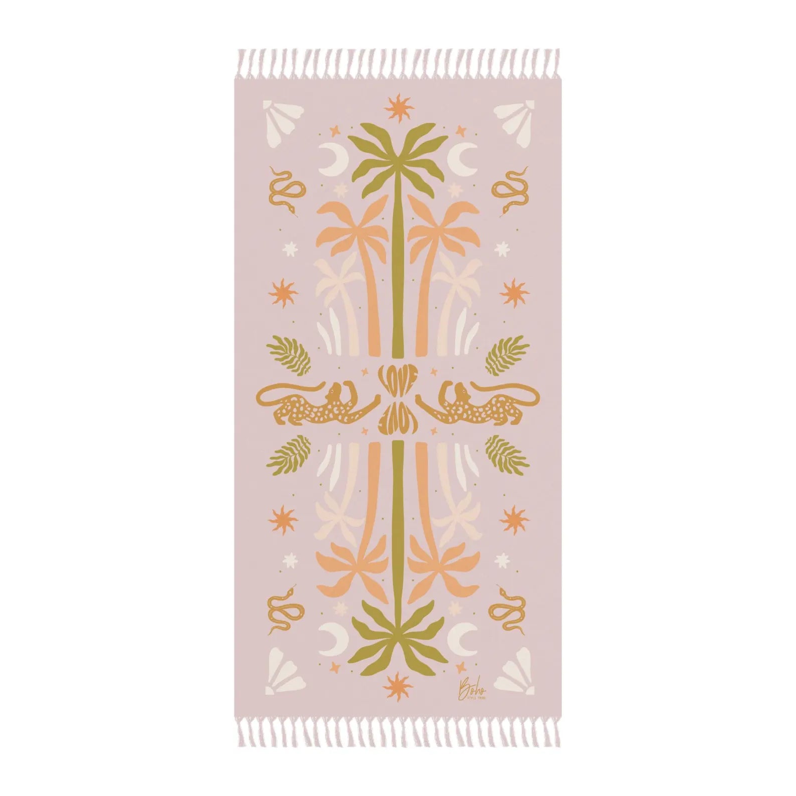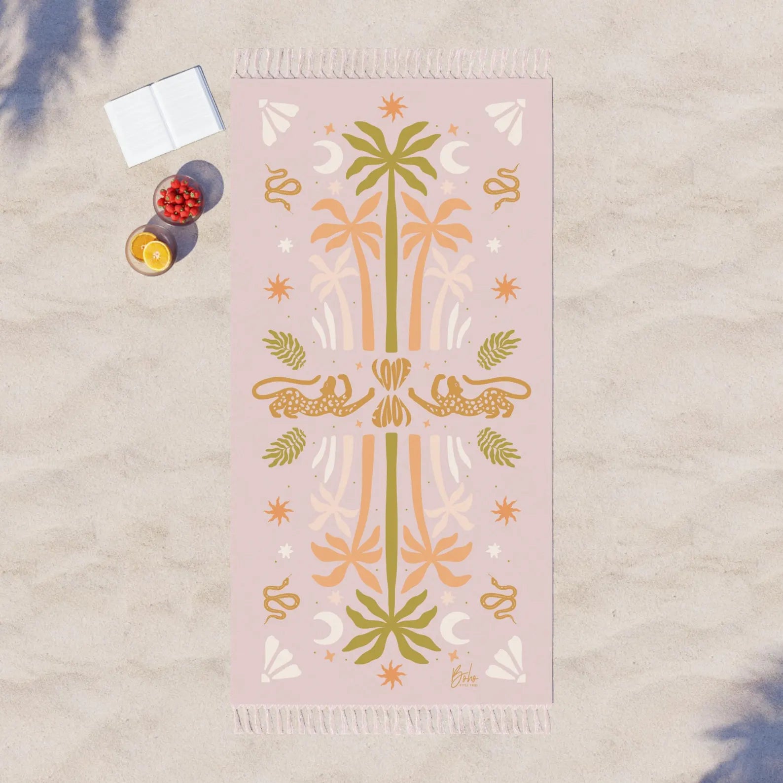 Our Boho Beach Cloth brings laid back luxury to every sunny adventure. Designed with bold jaguars, palm trees, and tropical motifs, this vibrant cloth radiates a relaxed bohemian vibe, perfect for beach vacations, summer getaways, picnics, festivals, or as a stylish wrap. Made from 100% polyester, this compact beach blanket is ultralightweight, quick drying, and durable enough for all your outdoor escapes. Measuring 38" × 81", it’s spacious enough for lounging, sharing, or wrapping yourself in effortless style. Knotted tassels on the edges add a touch of flair, while the vibrant, crisp printing ensures long lasting color. Whether you're sunbathing, hiking, or setting up camp, this multifunctional beach blanket is your must have companion.